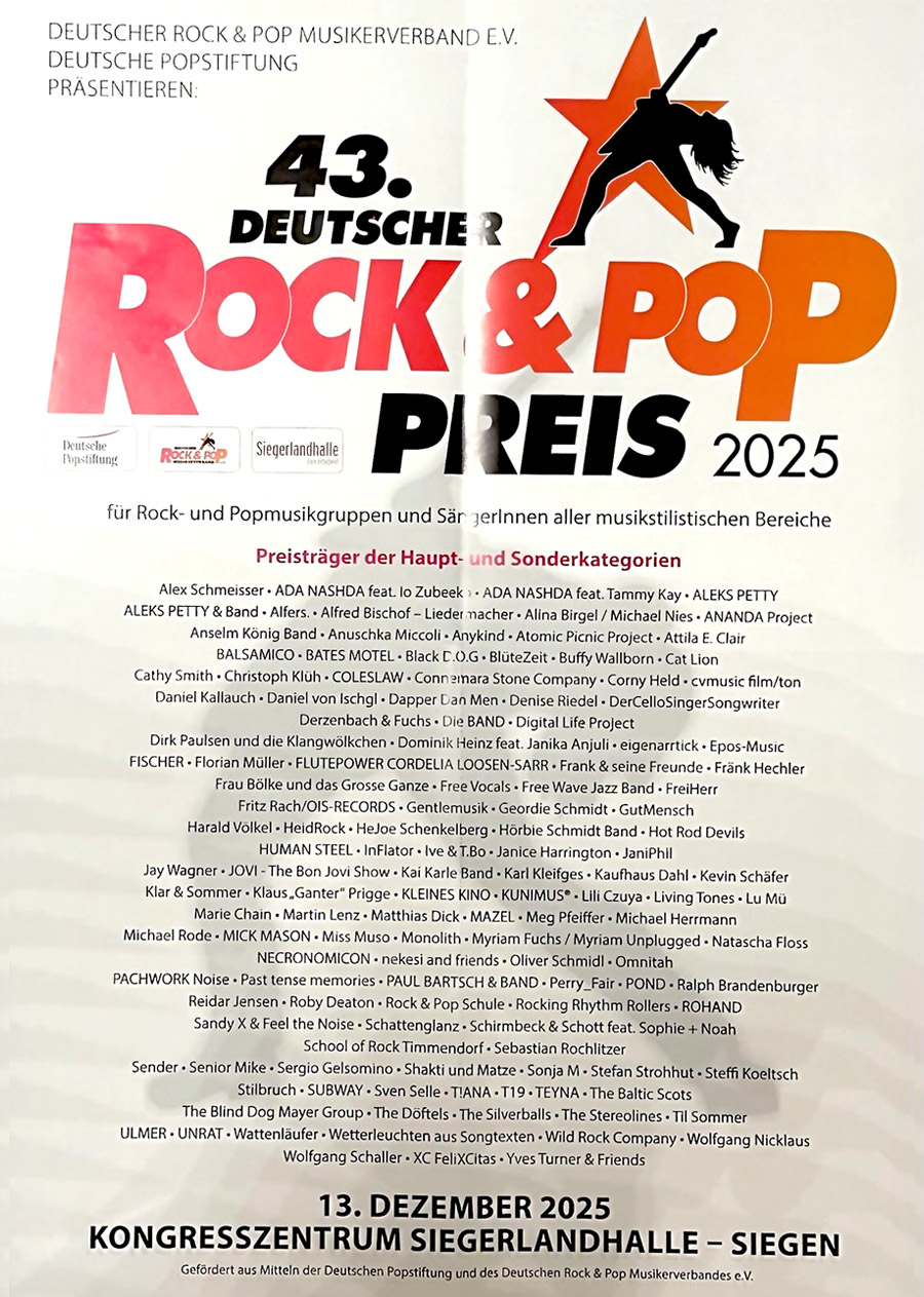 Wir haben einen Preis für ICH VERMISS DICH erhalten! Welch eine Freude!! Da möchte ich mich doch gleich nochmal bei Lutz Sommer bedanken, der für die Aufnahme, die Gitarre und das zauberhafte Arrangement verantwortlich ist. Bei Frowin Ickler, für seine am Bass perfekt eingefangene "Stimmung" für diesen Song und Luca Dechert am Schlagzeug, der gespielt hat, wie ich es nie anders hätte haben wollen ;O) Vielen lieben Dank!!