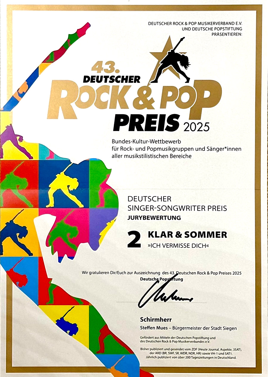 Wir haben einen Preis für ICH VERMISS DICH erhalten! Welch eine Freude!! Da möchte ich mich doch gleich nochmal bei Lutz Sommer bedanken, der für die Aufnahme, die Gitarre und das zauberhafte Arrangement verantwortlich ist. Bei Frowin Ickler, für seine am Bass perfekt eingefangene "Stimmung" für diesen Song und Luca Dechert am Schlagzeug, der gespielt hat, wie ich es nie anders hätte haben wollen ;O) Vielen lieben Dank!!